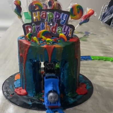 The clever cake features a working Thomas train set tunnelling through a rainbow layer cake, adorned with lollipops and a flashing 'Happy Birthday' sign.