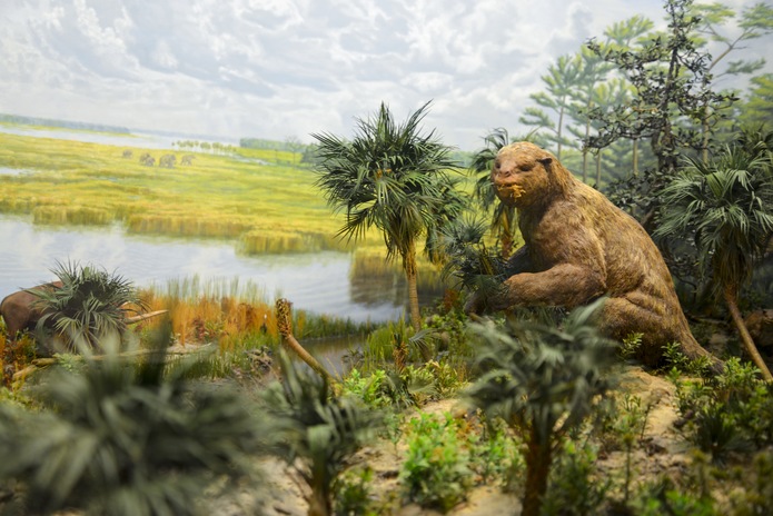 A diorama representing the habitat of a prehistoric Eremotherium laurillardi (Giant Ground Sloth).